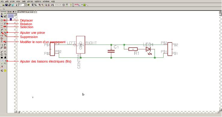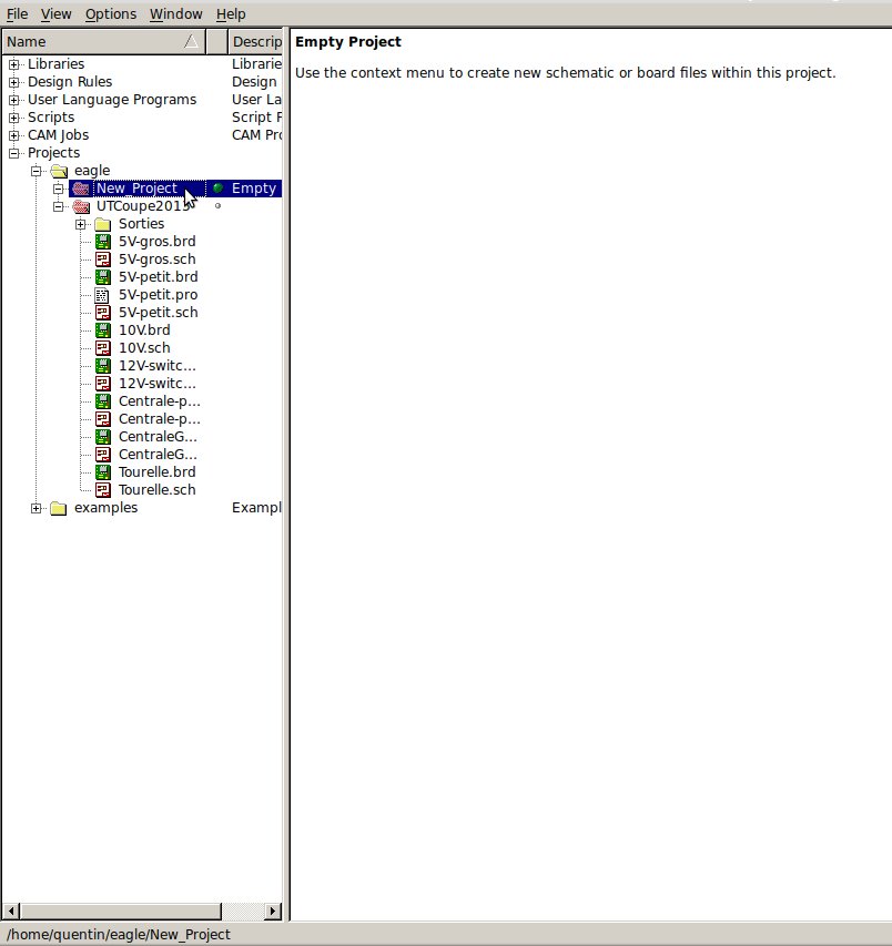 Eagle est un logiciel permettant de réaliser des cartes életronique assez facilement. L'interface est un peu vieillarde mais le logiciel marche bien. Premièrement, il faut reproduire le schéma de la carte à réaliser. Schema que l'on va ensuite exporter vers l'interface de routage : il faut alors tracer les circuits et placer les composants. Il ne reste alors plus qu'à exporter le tout. Il est important de noter qu'Eagle est un logiciel puissant qui peut servir à réaliser des cartes de manière très avancée. Toutefois, je n'expliquerai dans ce wiki qu'une méthode simple et rapide pour concevoir des cartes de complexité modérée, et surtout, destinées à être imprimée par UTCoupe. En effet, il est possible de concevoir des cartes sous une forme répondant aux attentes des “imprimeurs” professionnels, mais cela complique le processus n'est pas nécéssaire à une impression chimique at home. Pour plus d'informations à propos d'une utilisation d'Eagle approfondie, voici un tutoriel un peu plus développé : https://www.sparkfun.com/tutorials/108.